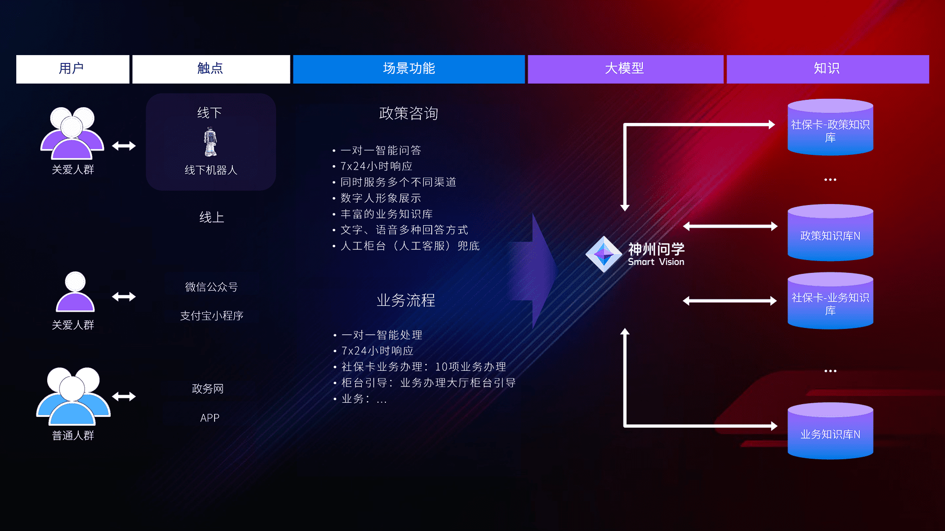 • 线上线下全覆盖:线上提供微信公众号、、、、支付宝小程序、、政务网、、app多种渠道,,,,与线下机器人形成完整服务体系。。。。