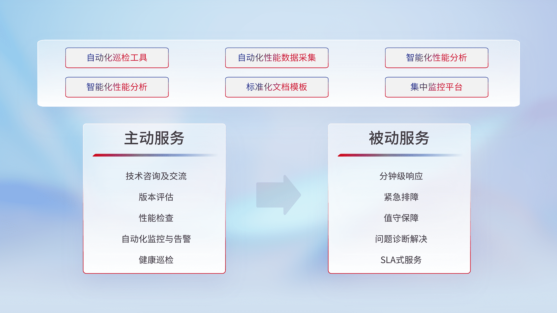 智能化工具和标准化文档,,,保障服务质量,,,,提供主动服务(包含技术咨询、、版本评估、、、性能检查、、、自动化监控与告警、、、、健康巡检)和被动服务包含(分钟级响应、、、、紧急排障、、、、值守保障、、、问题诊断解决、、SLA服务)。。
